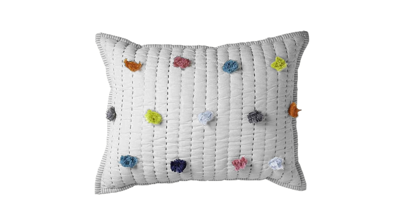 Organic Cotton Cushion with Hand Kantha Work with Blanket Stitch and Hand Made Pom Pom 40 x 40 CM